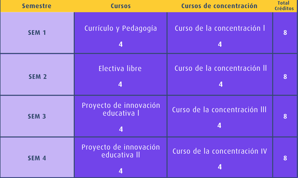 - Dos cursos para el desarrollo del trabajo de grado, cada uno de 4 créditos: Proyecto de innovación educativa 1 y Proyecto de innovación educativa 2.